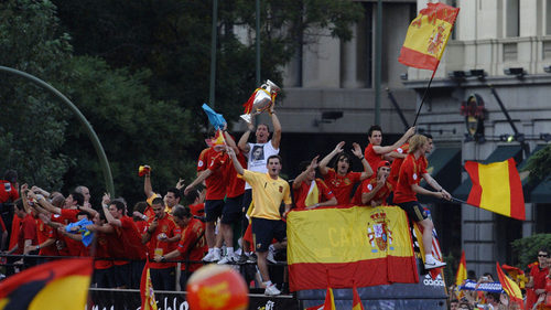 Los chicos de Luis Aragonés pasean la Eurocopa por las calles de Madrid.