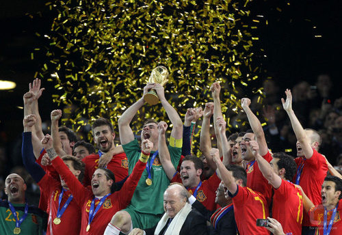 Con la Copa del Mundo en las manos, la Selección Española celebra su victoria en el Mundial 2010.