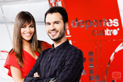 Lara Álvarez y Luis García sonríen en el plató de 'Noticias Cuatro Deportes'.