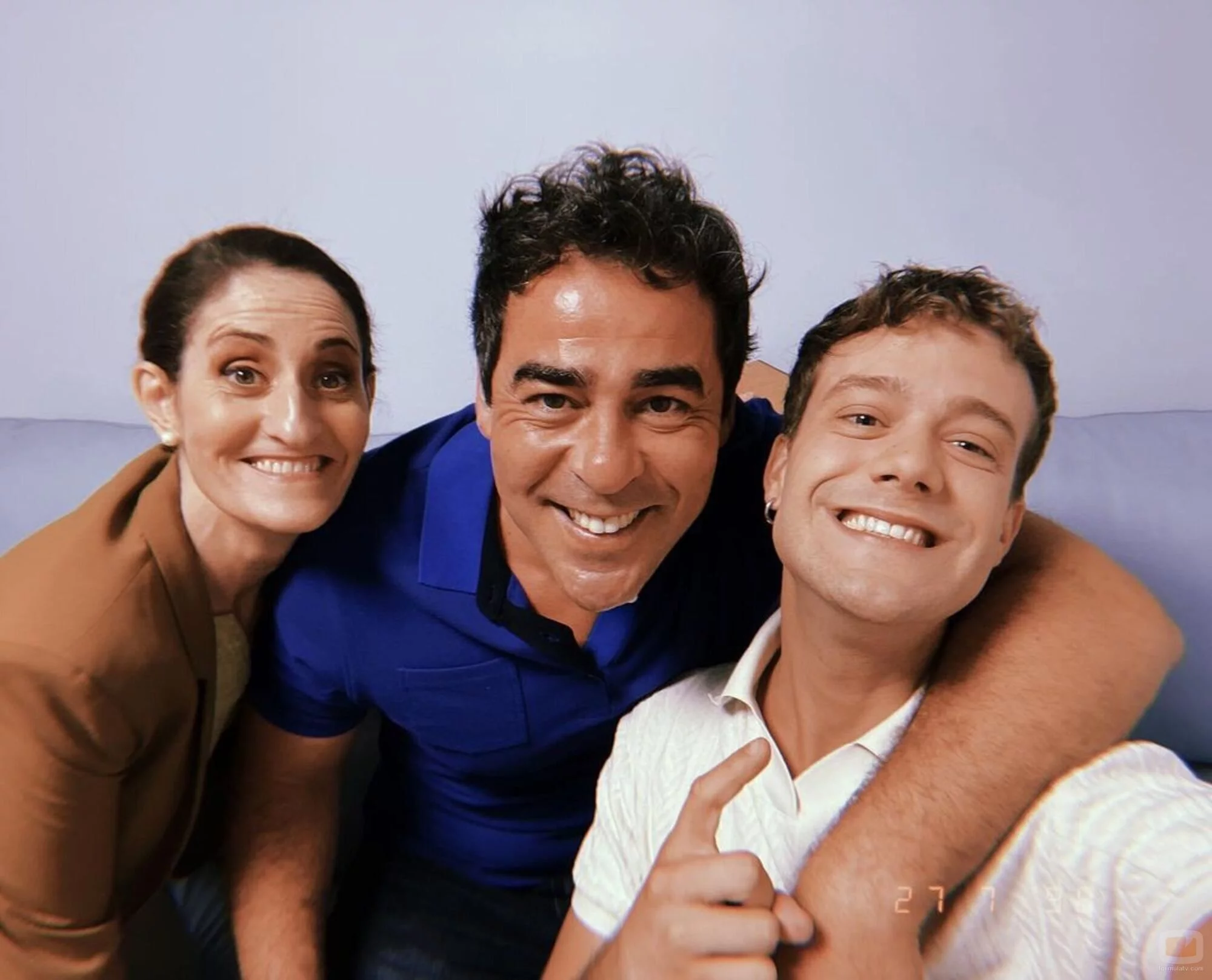 Los intérpretes de Greta, Amador y Giorgi en el rodaje de la temporada 13 de la comedia de Contubernio y Mediaset España.