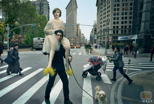 En una sobrehumana demostración de fuerza, Adam Driver lleva a Lena Dunham a hombros delante del edificio Flatiron de Nueva York.