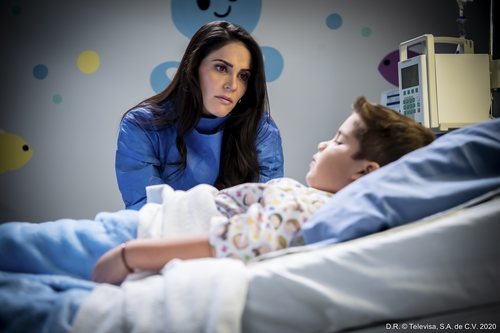 Elena (Eva Cedeño) mira a su hijo Nicolás (Leonardo Herrera) en el hospital, quien esta enfermo de leucemia en la telenovela latina 'Te doy la vida'.