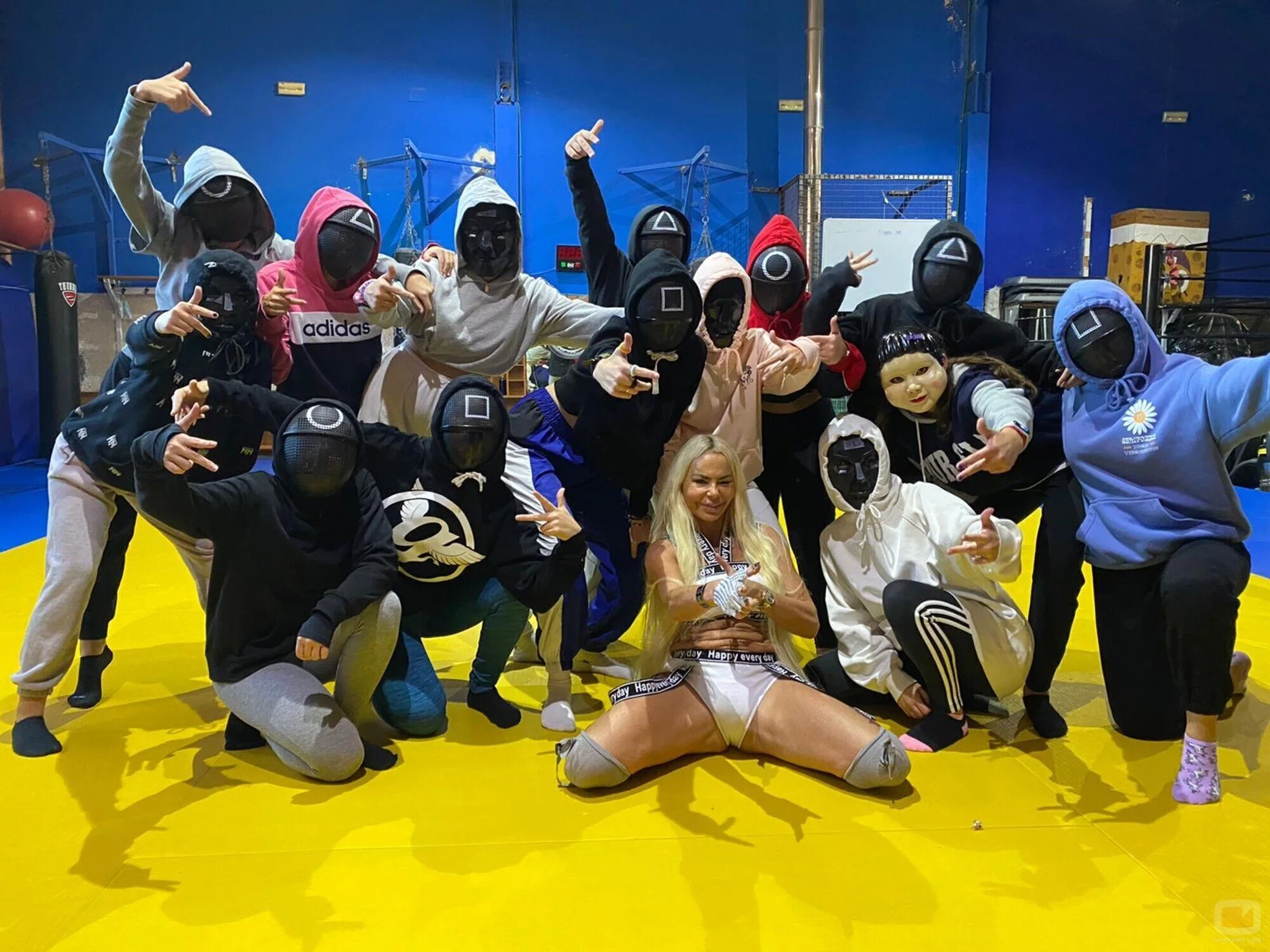 La ganadora de 'La casa fuerte' posa junto a sus bailarinas, vestidas con el atuendo de 'El juego del calamar', en la grabación del videoclip "¡Mi vida es mía! (La Mari)".