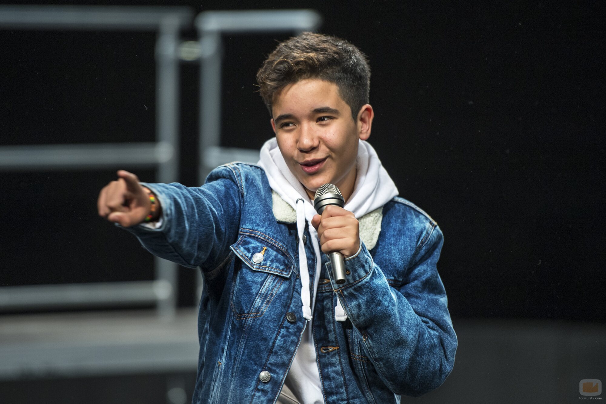 Levi Diaz mira al público mientras canta algunos de los versos de su canción "Reír", la propuesta española para esta edición del Festival de Eurovisión Junior 2021.