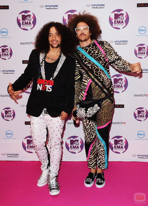 Redfoo y SkyBlu de LMFAO posan en la alfombra roja de los MTV Europe Music Awards 2011 en Belfast.