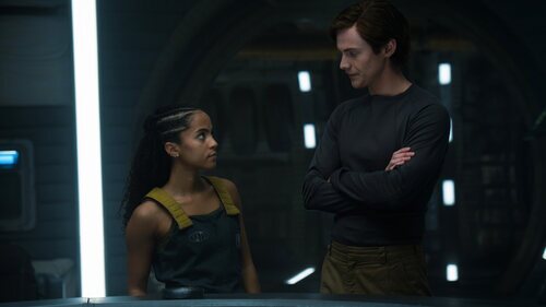 Cassian Bilton y Lou Llobell aparecen en una foto del capítulo 3x05 de 'Fundación', la serie de televisión de Apple TV+.