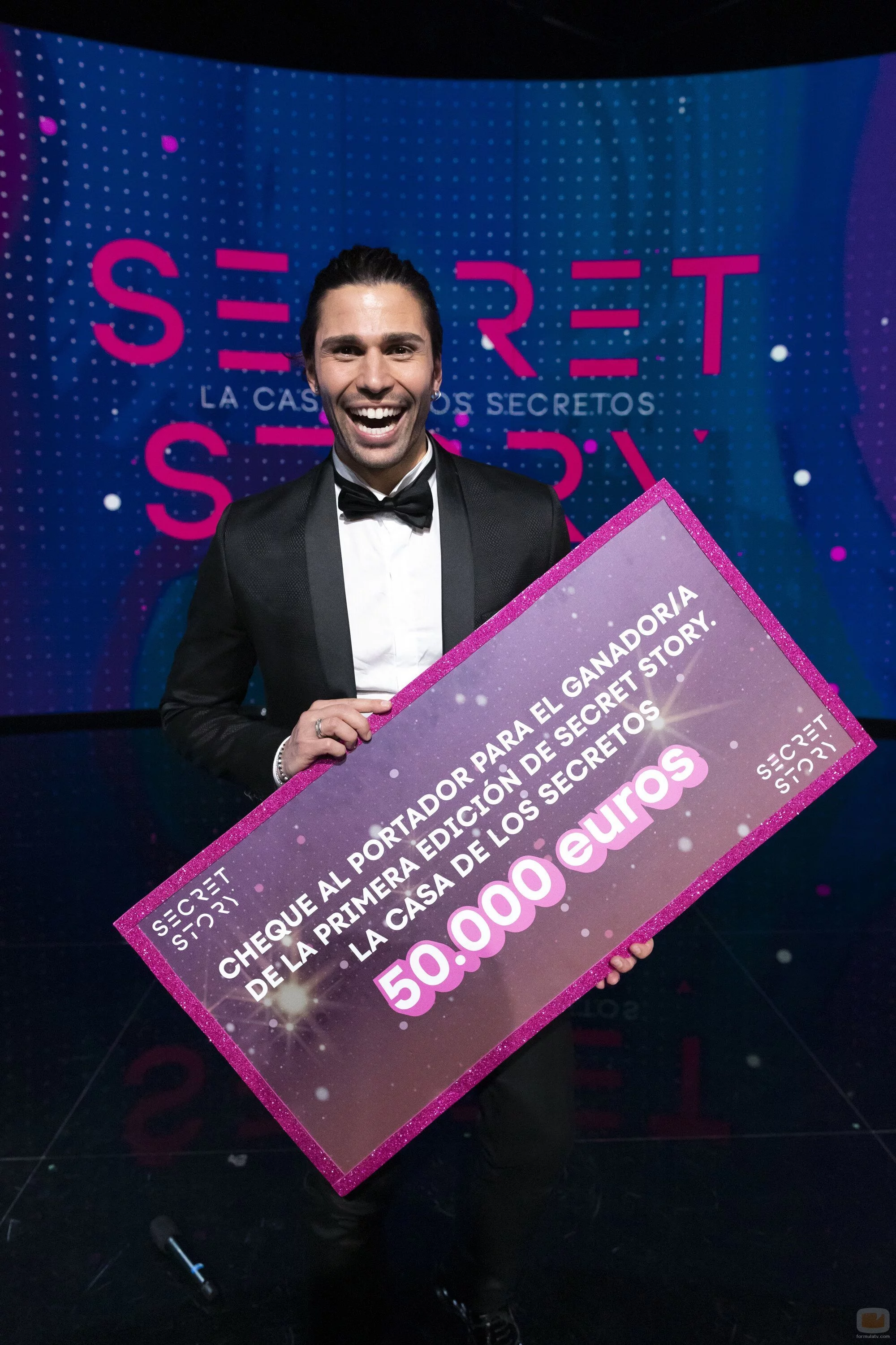 Luca Onestini posa junto al cheque de 50.000 que recibió como premio. El italiano es el ganador de 'Secret Story: La casa de los secretos', el reality producido por Zeppelin TV y Mediaset.