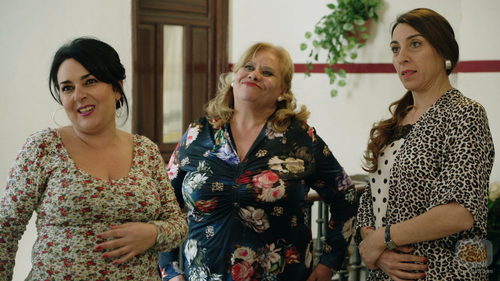 Luci (Carmina Barrios) con sus amigas en el portal, siempre atentas de todo lo que pase entre Iñaki y Carmen en el cuarto capítulo de 'Allí abajo'.