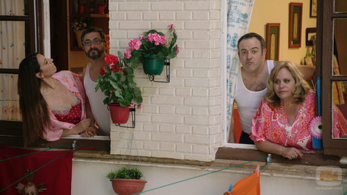 Tras la fiesta en el anterior episodio, Luci, Koldo, Peio y Piedad asomados en la ventana del patio en el séptimo capítulo de 'Allí abajo'.