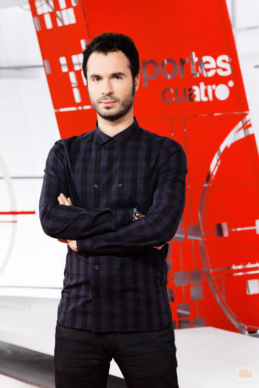 Luis García posa con una camisa de cuadros negros y morados en el plató de Cuatro.