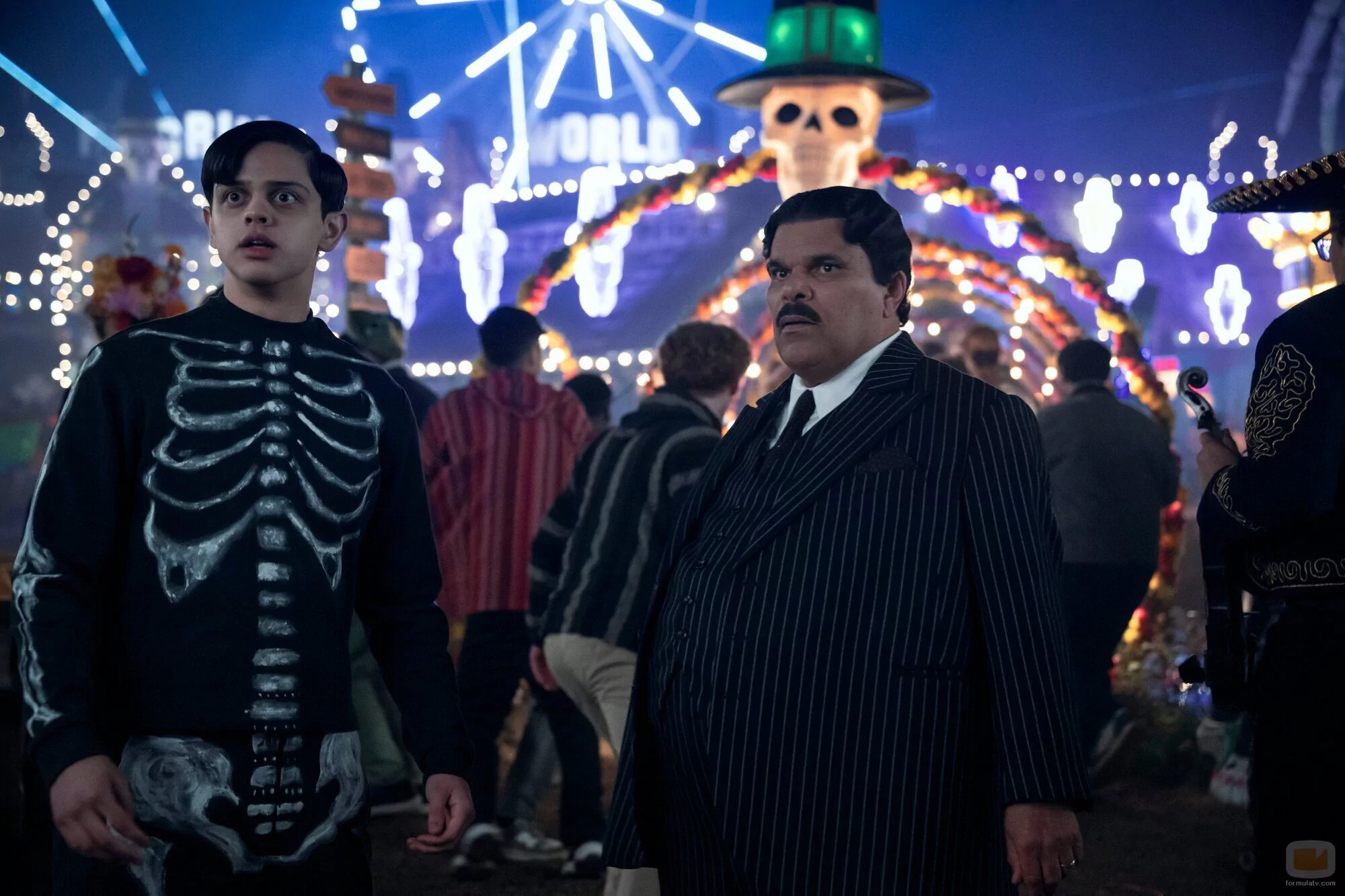 Luis Guzmán y Isaac Ordonez aparecen en una foto promocional del episodio 2x05 de 'Wednesday', la serie de televisión de Netflix.
