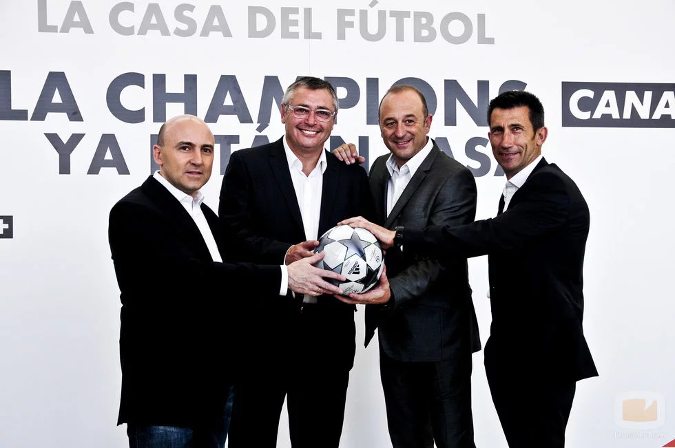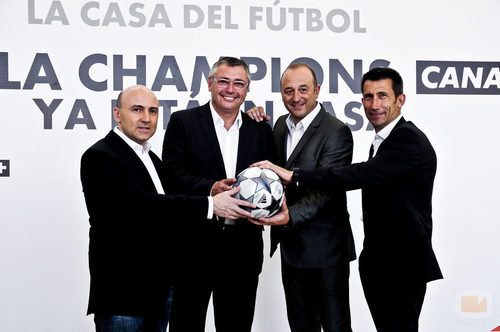 Maldini, Michael Robinson, Nacho Aranda y Carlos Martínez sostienen un balón de la Champions