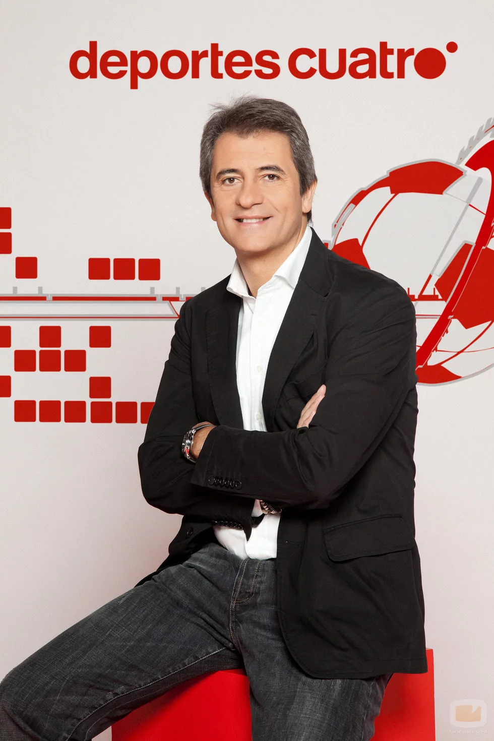 El presentador deportivo posa frente a los decorados de su programa, también conocido como "Los Manolos".