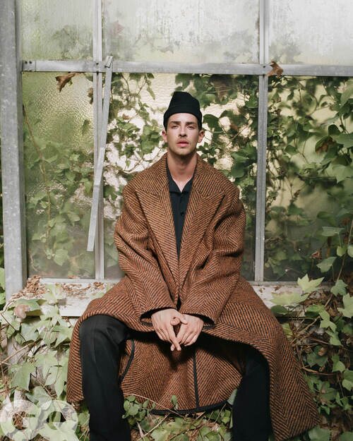 Manu Ríos, sentado en ventanal envuelto de hiedra para GQ