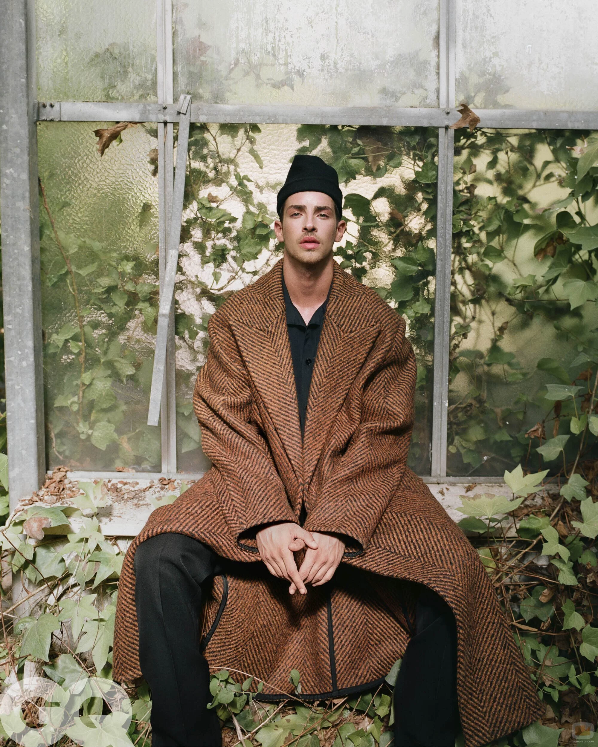 El actor de moda posa en una fotografía en la que luce un gran abrigo marrón mientras que un gorro cubre su cabeza.