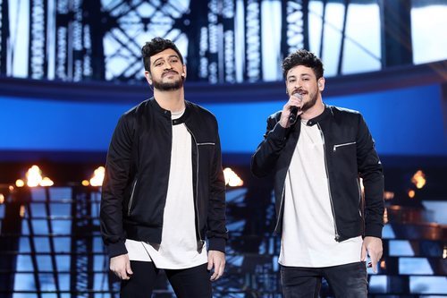 Manu Sánchez, concursante de 'Tu cara me suena', imita a Cepeda e interpreta la canción "Esta vez" en la novela gala del concurso, junto al auténtico Luis Cepeda.