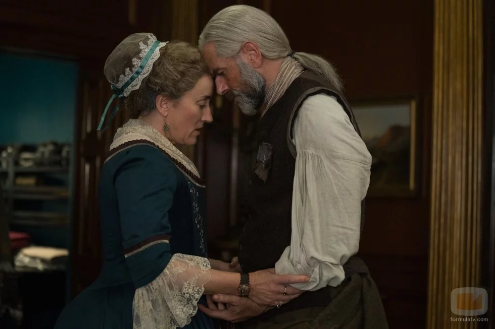 Jocasta Cameron, tía de Jamie Fraser, junto a Murtagh Fraser despidiéndose en un capítulo de la cuarta temporada.