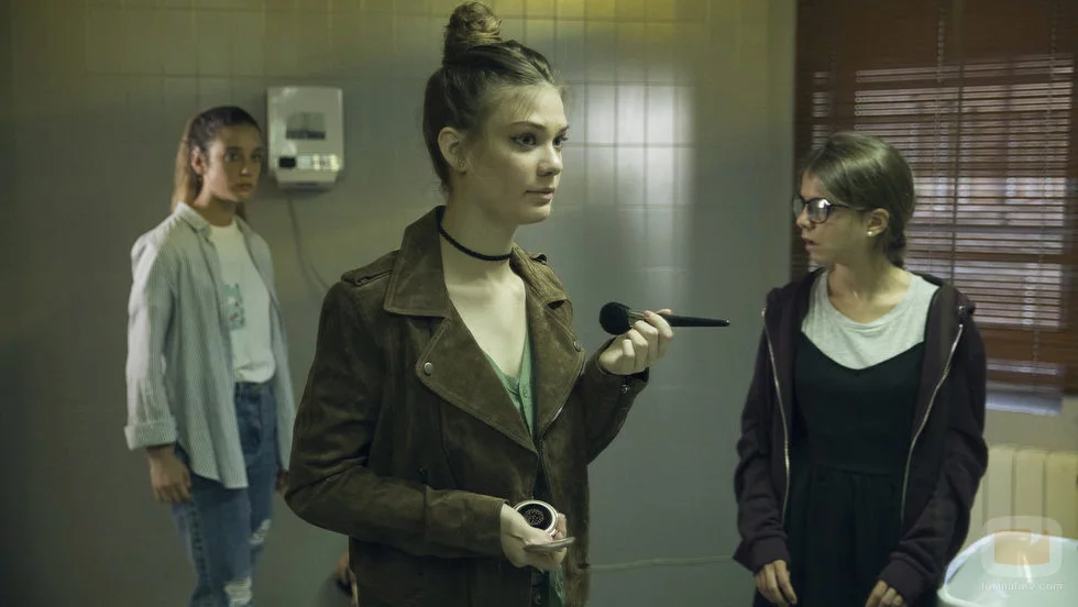 Las jóvenes actrices Nerea Elizalde, María Pedraza y Lucía Díez se maquillan en el baño. Todas ellas forman parte del juvenil reparto de 'Si fueras tú'.