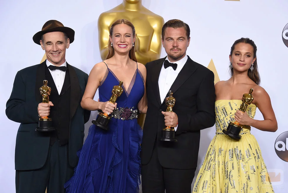 Mark Rylance, Brie Larson, Leonardo DiCaprio y Alicia Vikander posan con sus premios en la gala de los Premios Oscar 2016