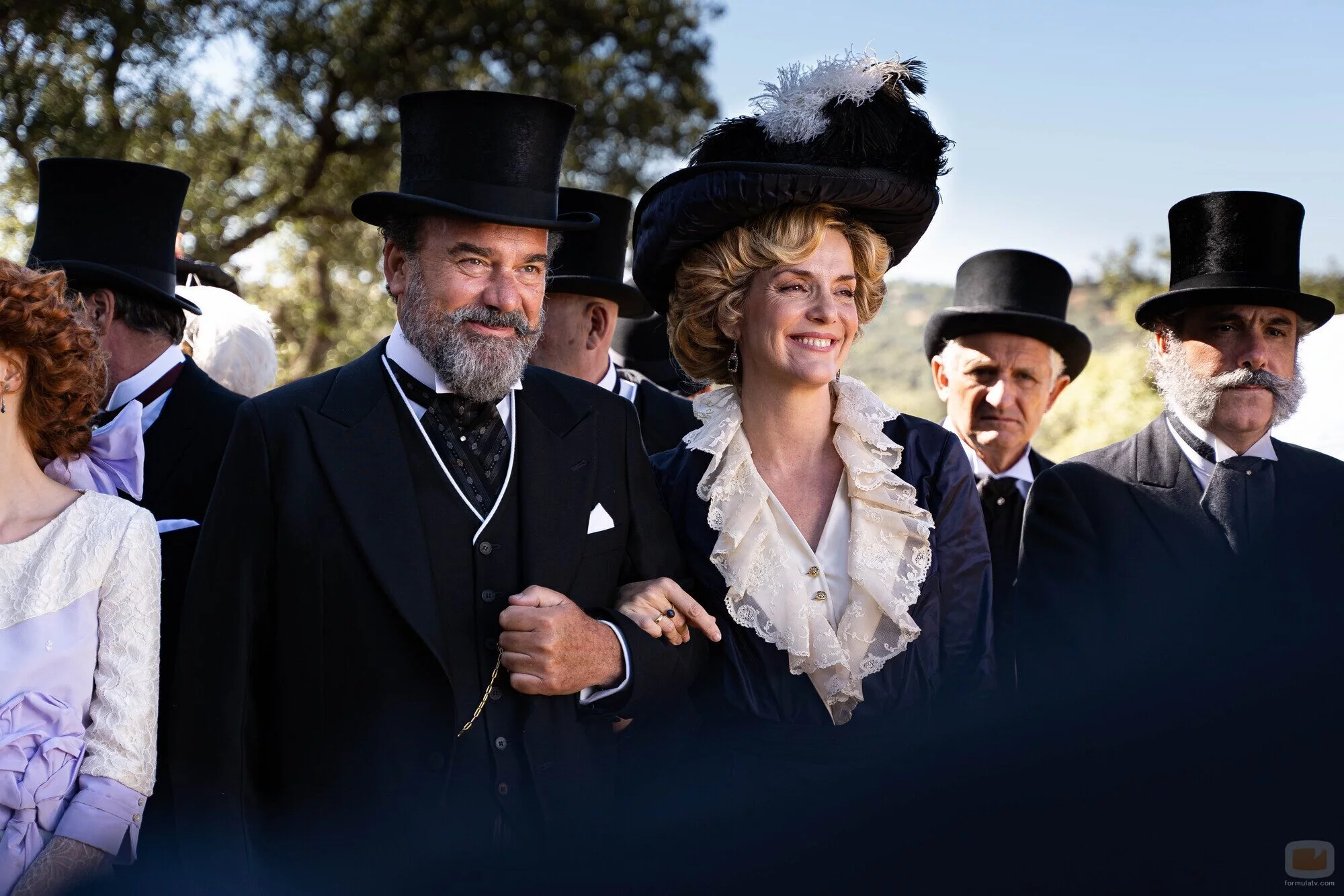 Alonso Luján (Manuel Regueiro) y Cruz Ezquerdo (Ana Garcés), los marqueses Luján, se ríen al aire libre agarrados del brazo.