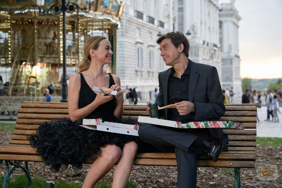 Marta Hazas (Marta Valdivia) y Javier Veiga (Javier Rubirosa) comen pizza sentados en un banco en la segunda temporada de 'Pequeñas coincidencias'.