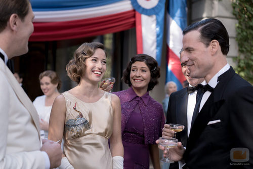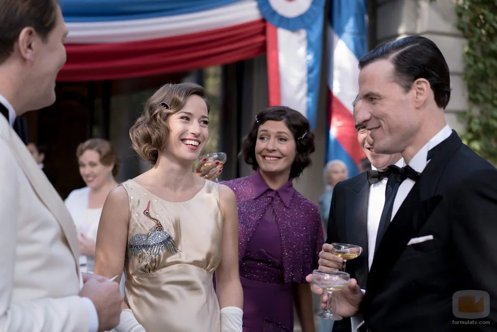 (1x01) Marta Ribas, la protagonista de la serie, riéndose en un evento social rodeada de conocidos, en el primer episodio de 'La sonata del silencio'