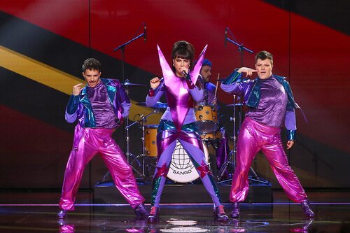 Fotografía de la actuación retrofuturista de Marta Sango con sus bailarines durante la segunda semifinal del Benidorm Fest.