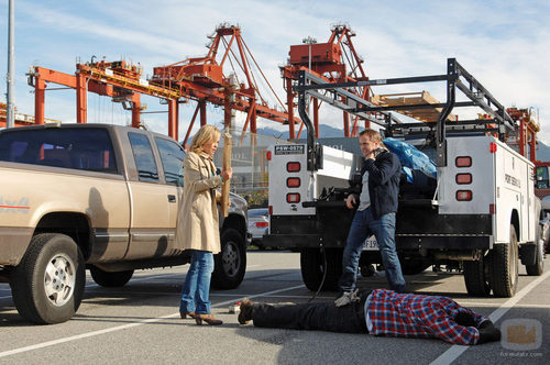 Marta Walraven con una madera en sus manos al lado de un cadáver en el primer capítulo de 'Venganza'.