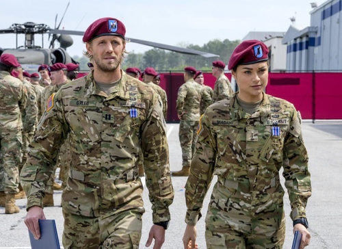 Nora Madani (una de las primeras mujeres piloto de la unidad) y su capitán Leland Gallo con el uniforme de militar en 'Valor'.