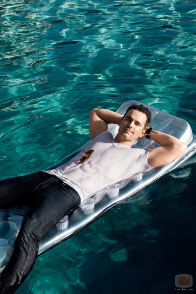 Matt Bomer sobre una colchoneta en la piscina para la revista Men's Fitness