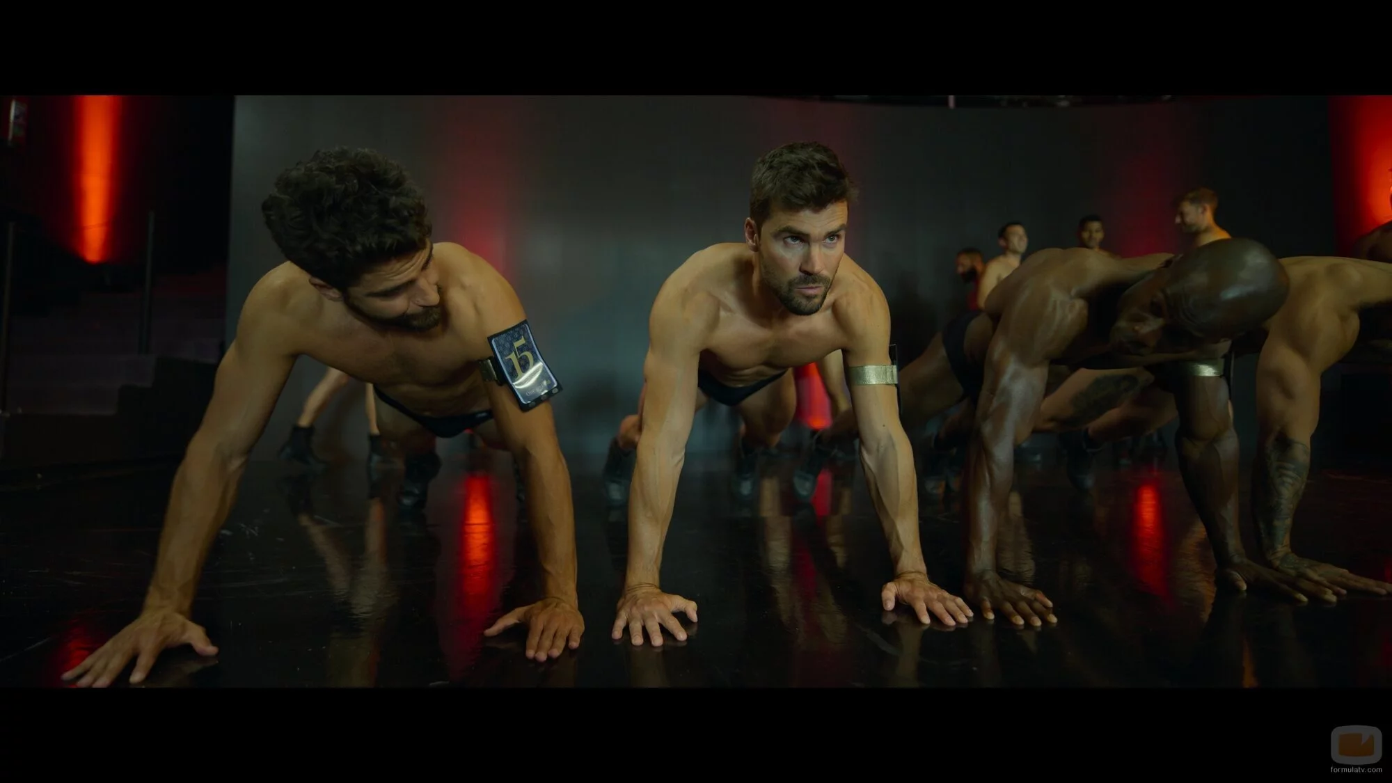 Metiéndose en la piel de sus personajes, los encargados de dar vida a Darío, Iván y Germán hacen flexiones en una de las escenas de la segunda temporada de 'Toy Boy'.