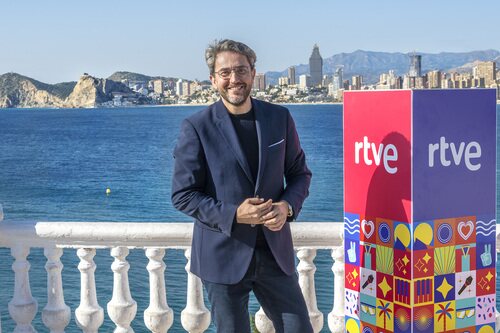Posado del presentador del Benidorm Fest, Máximo Huerta, en el Balcón del Mediterráneo de la ciudad alicantina.