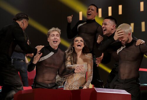La alegría de Melody y su cuerpo de baile al conocer que es la ganadora del Benidorm Fest y hacerse con el Micrófono de Bronce.