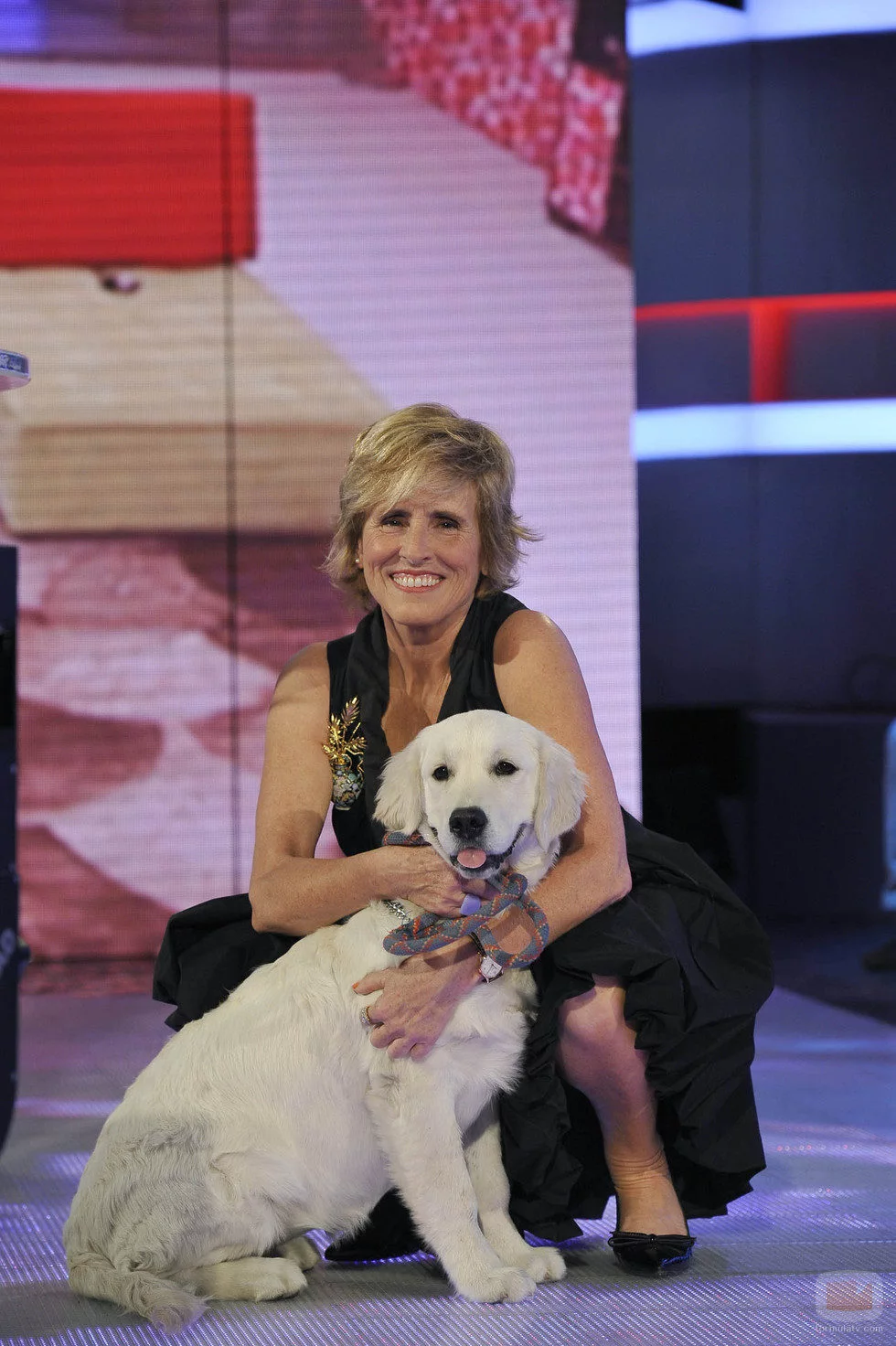 Mercedes Milá posa con la perra con la que han convivido los concursantes de 'Gran Hermano 12+1'.