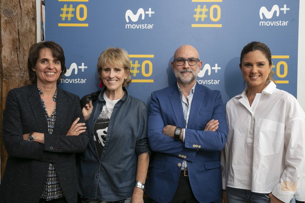 Mercedes Milá, muy feliz por volver a televisión tras dos años alejada de ella, posa con el equipo de su nuevo programa 'Scott y Milá'.