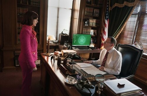 Michael Emerson y Carrie Preston aparecen en una foto promocional del episodio 2x07 de 'Elsbeth' con fecha de estreno el Jueves, 12 de Diciembre de 2024.