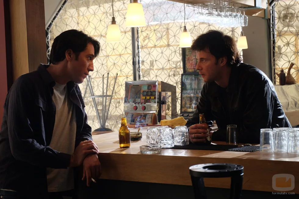 Los dos amigos se encuentran en un bar del barrio y mantienen una conversación mientras se miran, con el semblante serio, en 'Apaches', la nueva serie de Antena 3.
