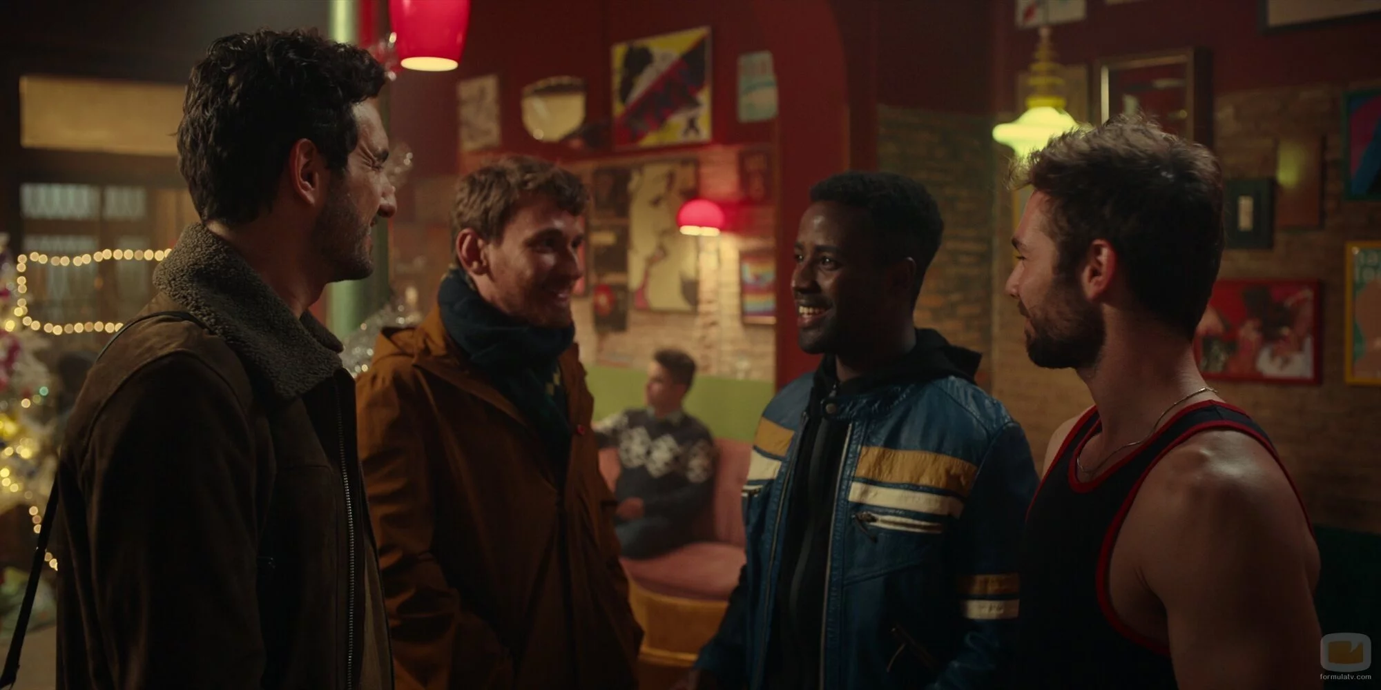 Los cuatro amigos están reunidos en un local con decoración navideña en la comedia romántica de Netflix, 'Smiley', protagonizada por Miki Esparbé y Carlos Cuevas.
