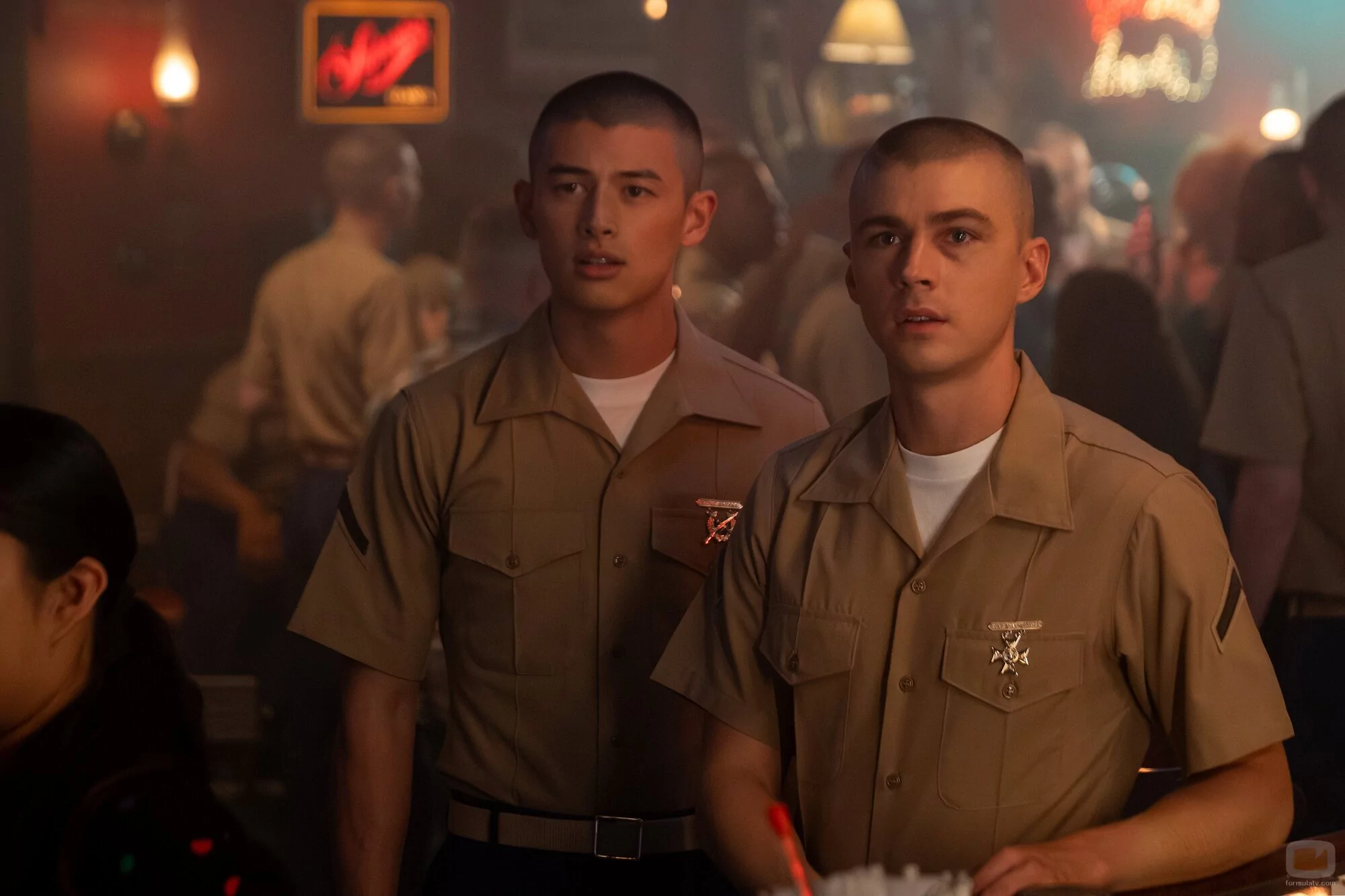 Liam Oh y Miles Heizer aparecen en una foto promocional del episodio 1x08 de la serie 'Reclutas', la serie de televisión de Netflix.