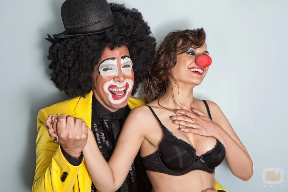La actriz de 'Aída' posa en sujetador y con la nariz de payaso junto a Torito, el sí disfrazado de payaso.
