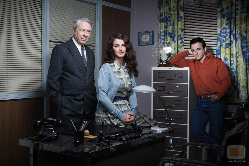 Mónica Estarreado, Enrique Berrendero, Juan Messeguer en la Agencia de viajes La Puntual de 'Amar es para siempre'