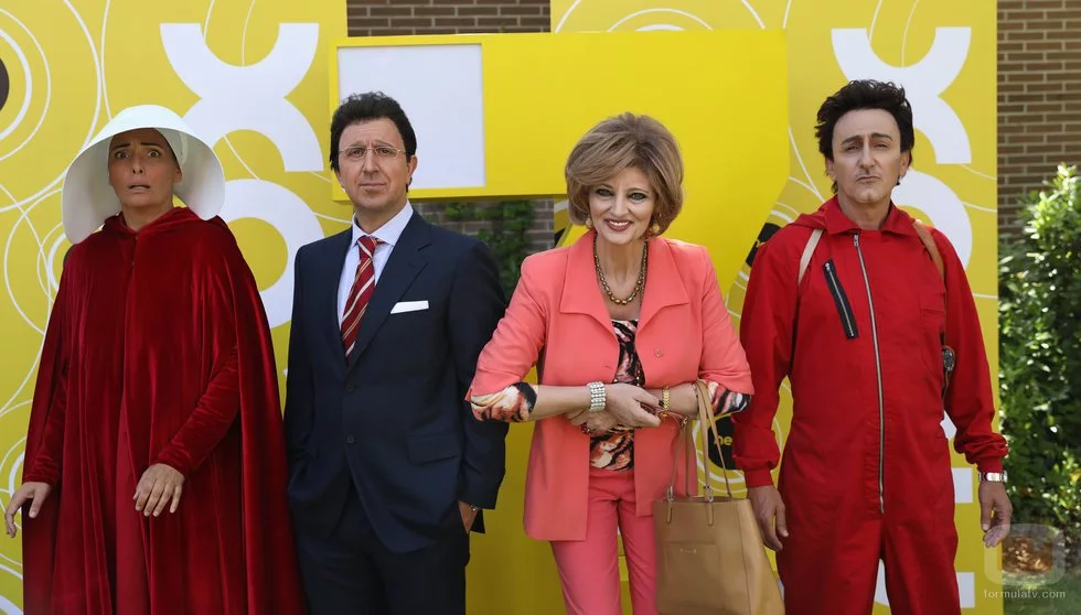 Los intérpretes Mónica Pérez ('El cuento de la criada'), Jordi Ríos (Matías Prats), Olga Hueso (María Teresa Campos) y David Fernández ('La casa de papel') posan en la presentación de 'Homo Zapping'.