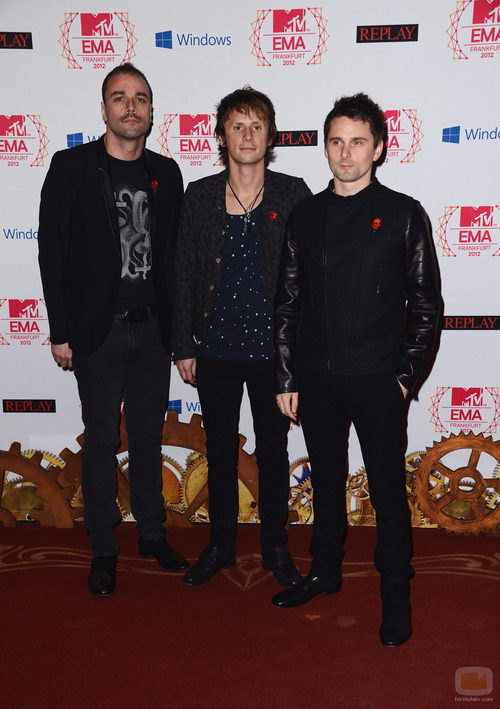 Chris Wolstenholme, Dominic Howard y Matthew Bellamy, de Muse, en los MTV Europe Music Awards 2012.