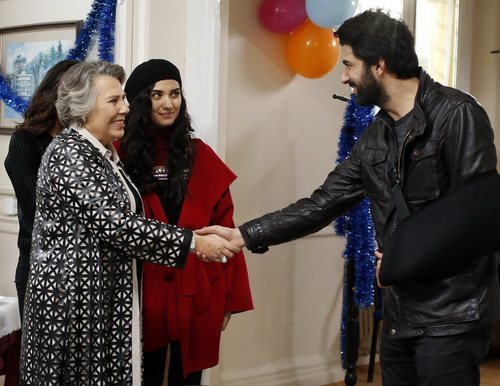 La tía Nedret da la bienvenida a Ömer dándole la mano bajo la atenta mirada de Elif, que se le escapa una sonrisa.