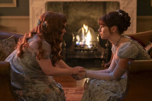 Nicola Coughlan y Claudia Jessie aparecen en una escena del episodio 'Seduciendo a Mr. Bridgerton' de la serie 'Los Bridgerton'.