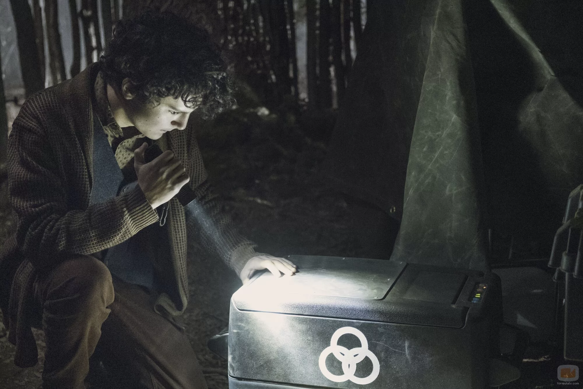 Nicolas Cantu alumbrando con una linterna una especie de cofre en uno de los capítulos de la segunda temporada de 'The Walking Dead: World Beyond'.