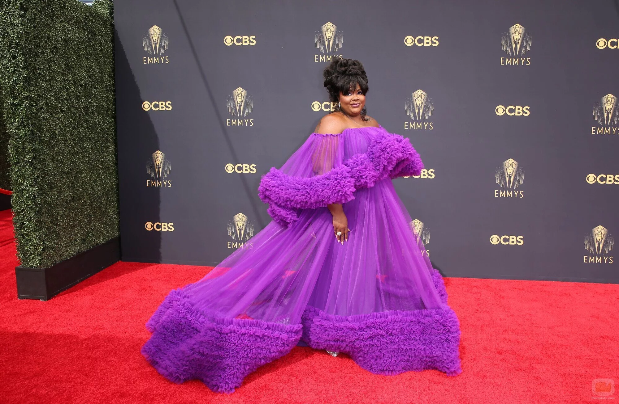 La presentadora de 'Nailed it!', Nicole Byer, posa en la alfombra roja de los Premios Emmy 2021 con un pomposo vestido morado.