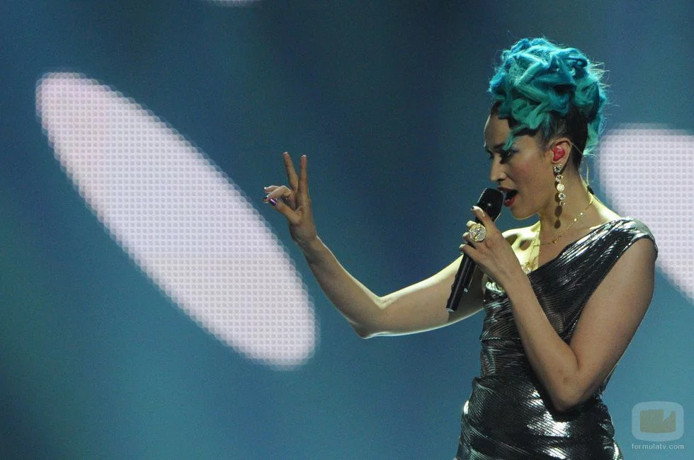 La representante de Italia mientras canta la canción "L'Amore È Femmina (Out Of Love)" en el Festival de Eurovisión 2012.