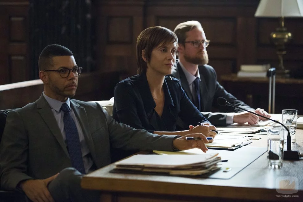 Kate Walsh interpreta a Olivia Baker, madre de la fallecida Hannah, que permanece sentada junto a sus abogados en un juicio en la segunda temporada.