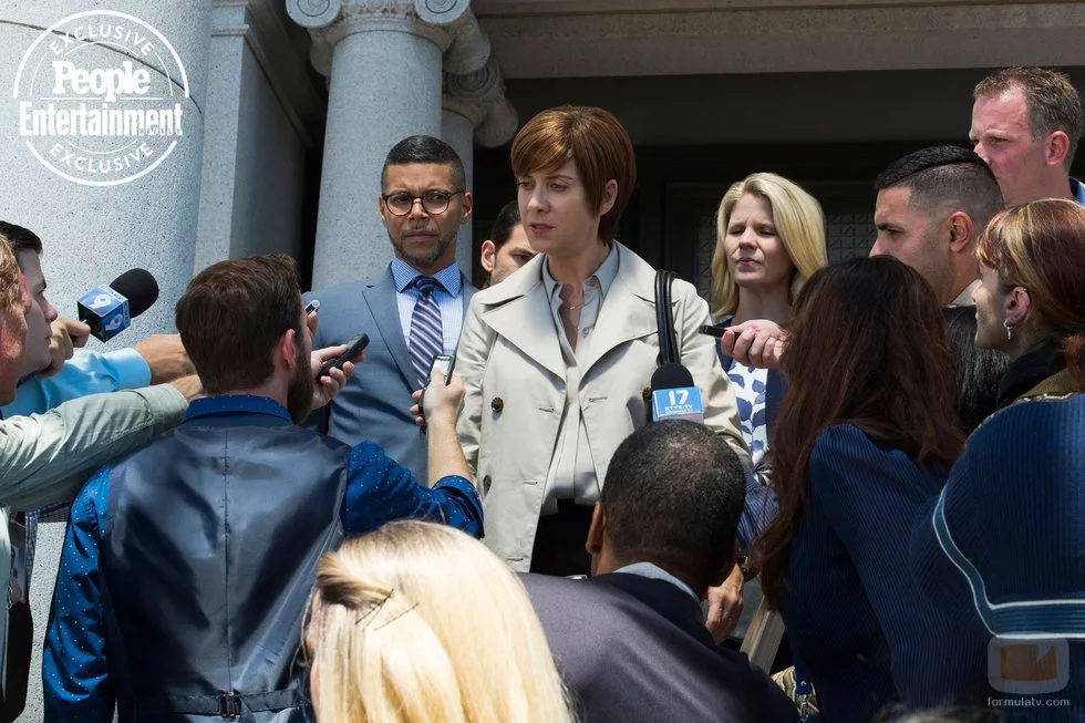 Kate Walsh interpreta a Olivia Baker, la madre de la fallecida Hannah, que habla con los medios tras la salida del juzgado en la segunda temporada de 'Por 13 razones' en Netflix.